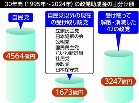 年額約315億円の国民の税金を政党が山分けする政党助成金の累計額が、1995年の制度開始から今年までの30年間で9484億7757万円にのぼることが、本紙の調べでわかりました。30年間に受け取った政党は51党。うち42党が政党助成金を手にすると分裂・合併・再分裂を繰り返し解散・消滅しました。国民・有権者から「浄財」を集める努力をせず、税金頼みになる政党助成金は「政党の劣化」をもたらしています。