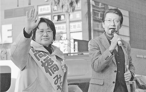![]() (写真)自民党市議の政治資金報告未提出問題を批判する(右から)田村、高橋両氏=19日、北九州市門司区 |