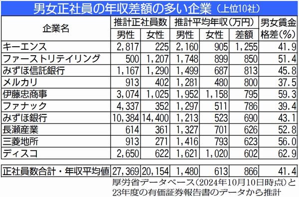調べによると、男女の賃金差額が最も大きかったのは電子機器メーカーのキーエンスで、年収差額は1255万円でした。次いで、ユニクロの親会社ファーストリテイリングで850万円、みずほ信託銀行813万円、フリマサイトを運営するメルカリ、伊藤忠商事などが続きました。男女差額の大きい10社は表の通り。10社の男女賃金差額を社員数と賃金額を掛け合わせた加重平均でみると866万円でした。