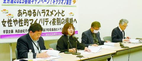 角田由紀子弁護士が講演し、ハラスメントの定義も罰則もない現行制度のもとで被害者救済などの「法的対応がおざなりになっている」と指摘し、国際水準の規制確立を訴えました。