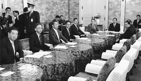 ![]() (写真)会談する浜田衆院議運委員長(正面)と国対委員長。左から2人目は塩川鉄也国対委員長=6日、国会内 |