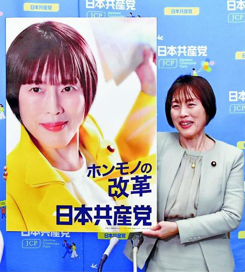 ![]() (写真)党の新しいポスターを紹介する田村智子委員長=6日、国会内 |