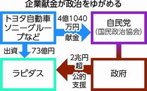 石破自公政権は、半導体の安定供給が「経済安全保障の観点からも喫緊の課題」だとして、半導体企業「ラピダス」への巨額な支援をしています。本紙の調べで、その「ラピダス」出資企業が2021~23年の3年間で4・1億円もの献金を自民党側にしていたことがわかりました。(藤沢忠明)