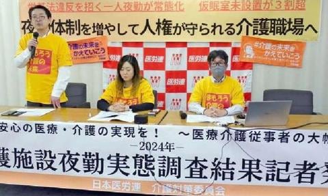 日本医労連は17日、厚生労働省で会見し、介護施設の夜勤実態調査結果を発表しました。16時間以上の夜勤が75%を占め、労働者の健康リスクや利用者の安全リスクを伴う長時間夜勤が改善されず、高止まりしていると強調しました。