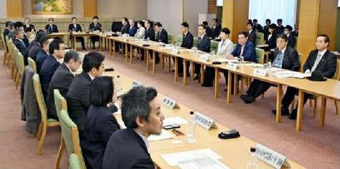 ![]() (写真)皇位継承全体会議に出席する(右列手前4人目から奥へ)岩渕友、塩川鉄也の両議員=10日、衆院議長公邸 |