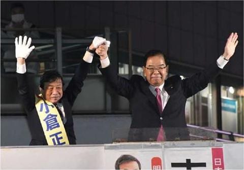 ![]() (写真)声援にこたえる志位和夫議長(右)と小倉正行知事候補=13日、千葉県船橋市 |