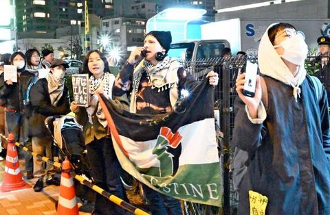 ![]() (写真)イスラエル大使館に向かって「虐殺やめろ」などと抗議する参加者=18日、東京都千代田区 |