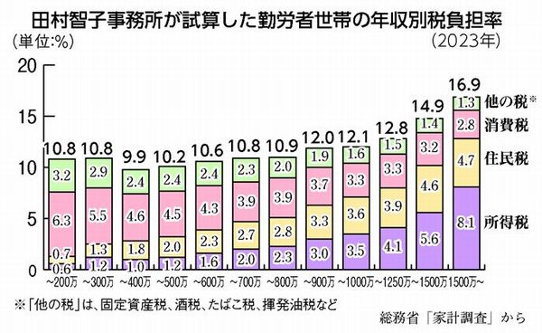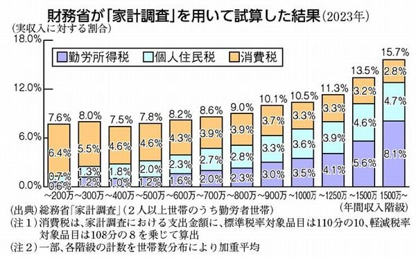 財務省の推計によると、年収200万円以下では、所得税0・6%で消費税は6・4%となるなど、年収900万円以下の世帯までは所得税より消費税の負担率が上回っています。税全体(所得税、住民税、消費税)の年収に占める負担率は、200万円以下の層から800万円まで7・6~9・0%で推移し、累進性が失われていることが示されています。
