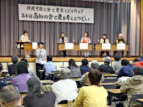 ![]() (写真)発言する紙氏(手前)。壇上は左から白川氏とパネリストの各氏=13日、高知市 |