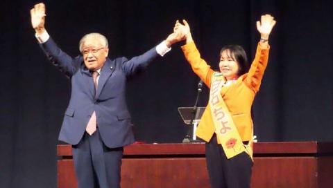 ![]() (写真)演説会参加者の拍手に応える(左から)市田、白石の両氏=19日、千葉市中央区 |