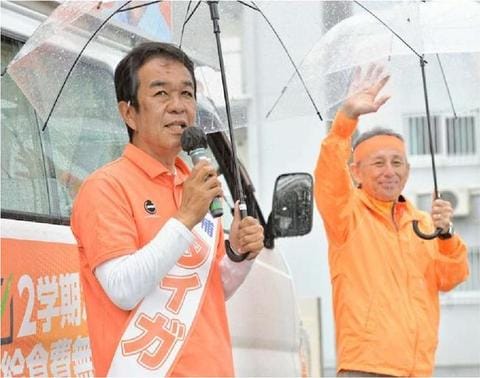![]() (写真)1票を争う大接戦の中、支援を訴えるタイガ候補(左)とデニー知事(右)=25日、沖縄県うるま市 |