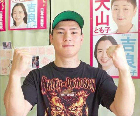 総合格闘技の武闘家で神空流(しんくうりゅう)を標榜(ひょうぼう)する信原空(のぶはらそら)さん(25)が4日、東京都新宿区の大山とも子事務所を訪れ、日本共産党を激励しました。