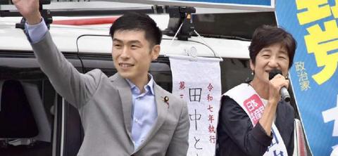 ![]() (写真)演説する田中候補(右)と山添氏=14日、東京都狛江市 |