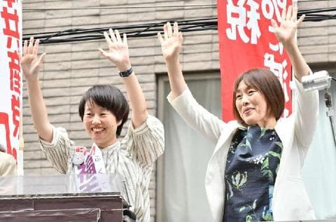 ![]() (写真)声援に応える田村智子委員長(右)と福手ゆう子候補=16日、東京都文京区 |