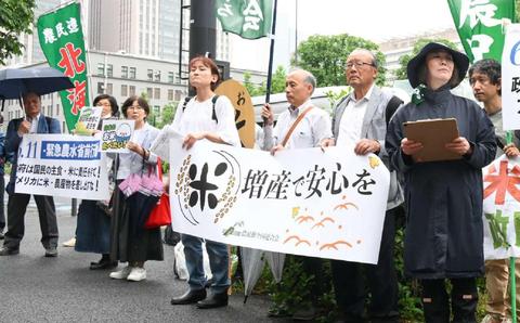![]() (写真)減反から米増産への転換を求め農水省に抗議する人たち=11日、農水省正門前 |