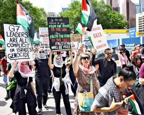 会場では「G7首脳はイスラエルのジェノサイド(集団殺害)に加担している」「G7は人々に食料を与えろ。戦争はいらない」「トランプ大統領を逮捕しろ」などのプラカードが目立ちました。