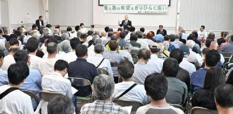 高松市で15日、農業問題に詳しい小松泰信・岡山大学名誉教授と日本共産党の白川よう子参院比例予定候補、地元の農家らを迎えて「食と農の希望をきりひらく集い」が開かれました。党香川県委員会の主催。会場は党内外の参加者でいっぱいになり、3分の1は主に若手の農業関係者でした。
