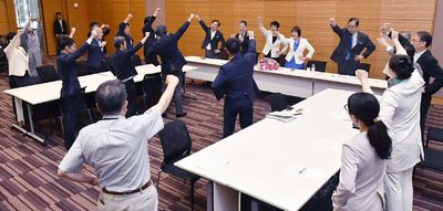 ![]() (写真)がんばろうと唱和する日本共産党国会議員団=20日、衆院第1議員会館 |