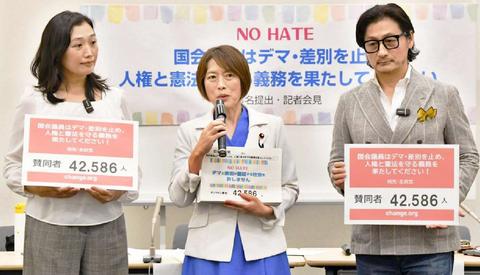 「外国人や外国にルーツを持つ人々への差別的な言動や排除の動きが広がっている」として参院選直後に、弁護士や作家、音楽プロデューサーら12人が賛同を呼びかけた「国会議員はデマ・差別を止め、人権と憲法を守る義務を果たしてください!」と題した署名4万2586人分を各政党に渡す記者会見が25日、国会内で開かれました。