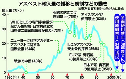 吸いこんでから二十―三十年以上も後に悪性腫瘍(がん)を引き起こすアスベスト(石綿)。政府の遅すぎる対応が日本での被害の深刻化と不安を広げています。WHO(世界保健機関)やILO(国際労働機関)がアスベストの危険を警告してからすでに三十数年たつのに、アスベスト完全禁止は二〇〇八年という怠慢――。政府の姿勢が問われます。(宇野龍彦)