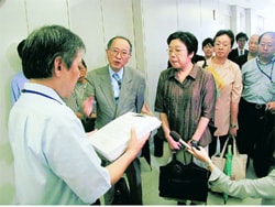 ![]() (写真)請願書を手渡し「つくる会」教科書を採択するなと訴える自由法曹団東京支部の松井支部長(左から2人目)ら=26日、都庁 |