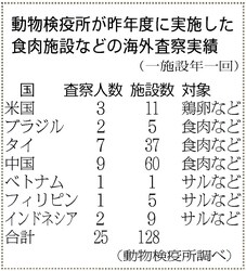 昨年度の実績をみると、担当したのは農水省動物検疫所の海外査察担当二十三人。対象は七カ国の食肉などの輸出施設百二十八カ所。のべ二十五人で査察し、一人平均五施設を年一回巡回している計算です。