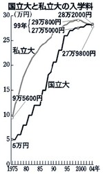 入学料は二〇〇四年度国立大二十八万二千円に対して、私立大二十七万九千八百円(平均、以下同じ)で、初めて国立の方が高くなりました(グラフ参照)。七五年度には国立五万円に対し、私立九万五千六百円で二倍の格差がありました。ここにきて入学料が逆転したのには、十八歳人口が減少するなかで私立大学の入学料が五年連続で下がったことも影響しています。