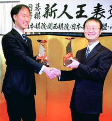囲碁第三十期新人王・金秀俊(キム・スジュン)七段と将棋第三十六期新人王・渡辺明(わたなべ・あきら)竜王・九段の表彰式が二日、東京・神宮外苑の日本青年館でおこなわれました。