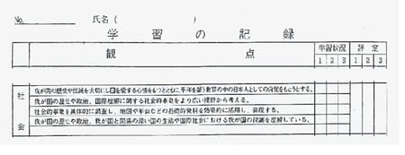 ![]() (写真)福岡市内のある小学校で使われた6年生の通知表(2002年度) では、社会科で「愛国 心」をABC3段階 で評価していた |