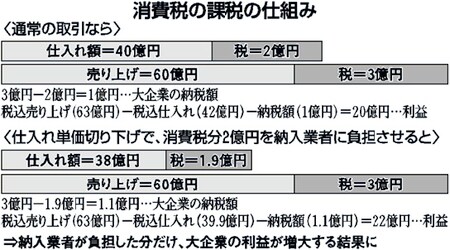 大企業の中には、部品などを納入する下請け中小業者などに「消費税分の単価切り下げ」を無理強いして、仕入れの際に実質的には消費税を払っていない場合もあります。それでも帳簿上は消費税を払った計算になりますから、売り上げにかかった消費税から引くことができます。