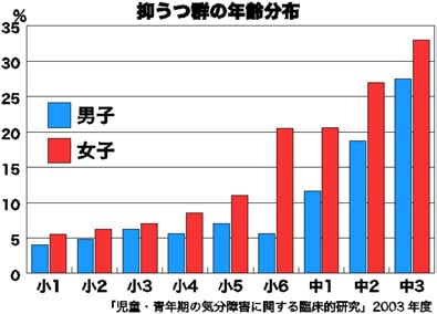 志位氏は北海道大学の伝田健三助教授のグループの調査をパネルで紹介しました(図)。小中学生のなかでうつ病になる危険のある「抑うつ傾向」が13%もあり、学年が上がるに連れて比率は増え、中学三年生では30%に達します。