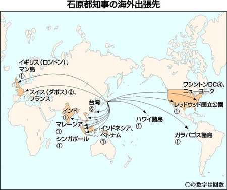 石原都知事の海外出張は、費用面でもけた違いです。資料が入手できた十五回分で総額二億四千四百万円、招待による相手側の一部負担があった四回を除くと、一回あたり二千万円使った計算です。