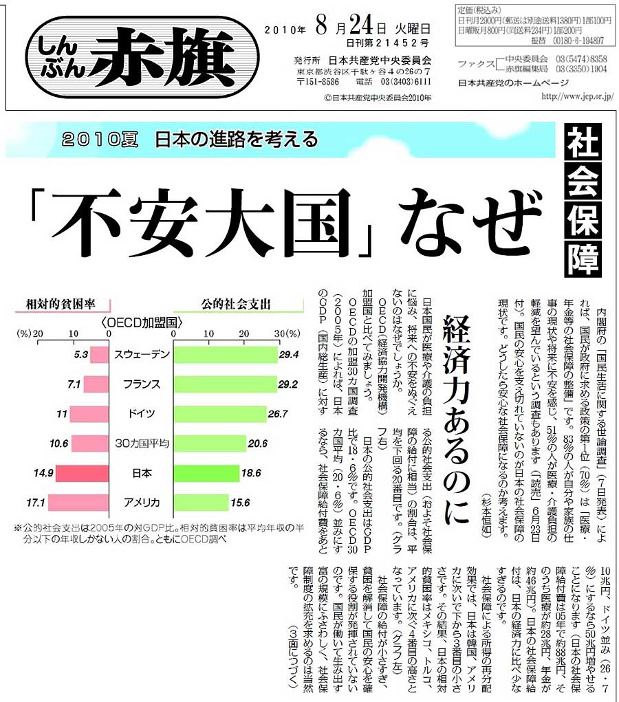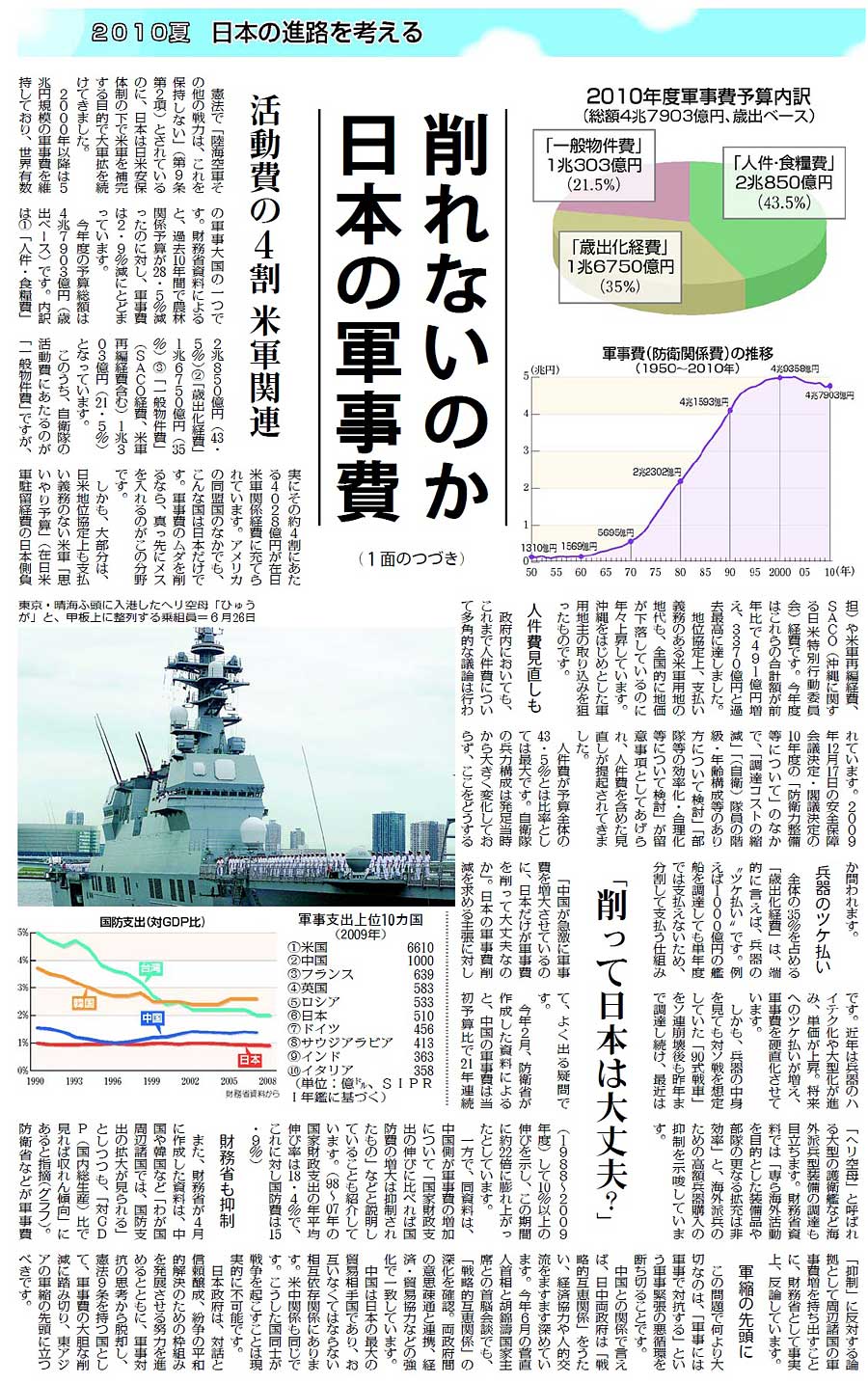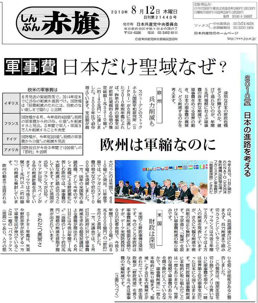 「2010夏 日本の進路を考える」シリーズは、これまで「軍事費」(12日付)、「国の借金」(18日付)、「経済改革」(19日付)、「社会保障」(24日付)を掲載。軍事費の企画「日本だけ聖域なぜ? 欧州は軍縮なのに」には、「たいへんわかりやすい好企画です(紙面1、紙面2)。軍事費の削減が(1)財政問題(2)東北アジアの平和、の二つの面から具体的な数字をあげて説得力のあるものになっています」(東京都中野区・男性)との感想が寄せられました。