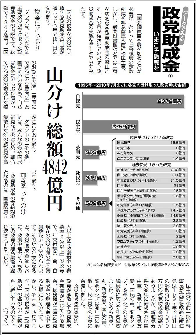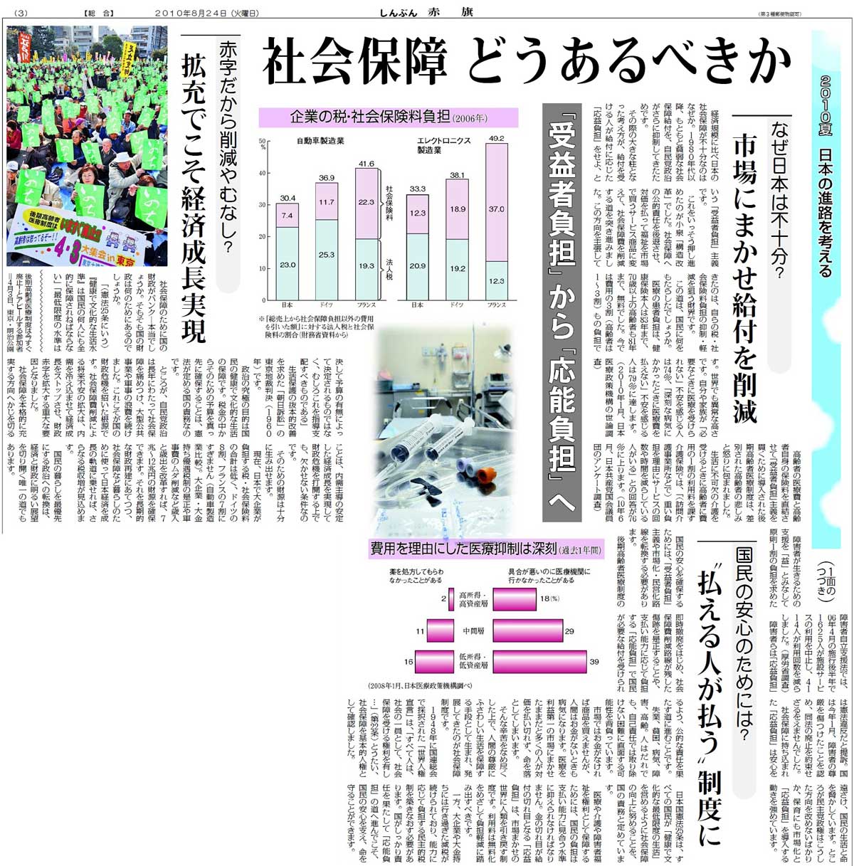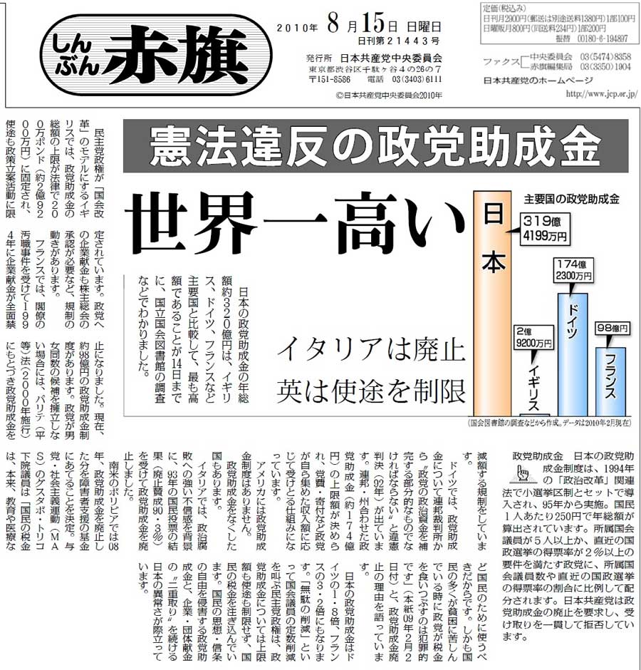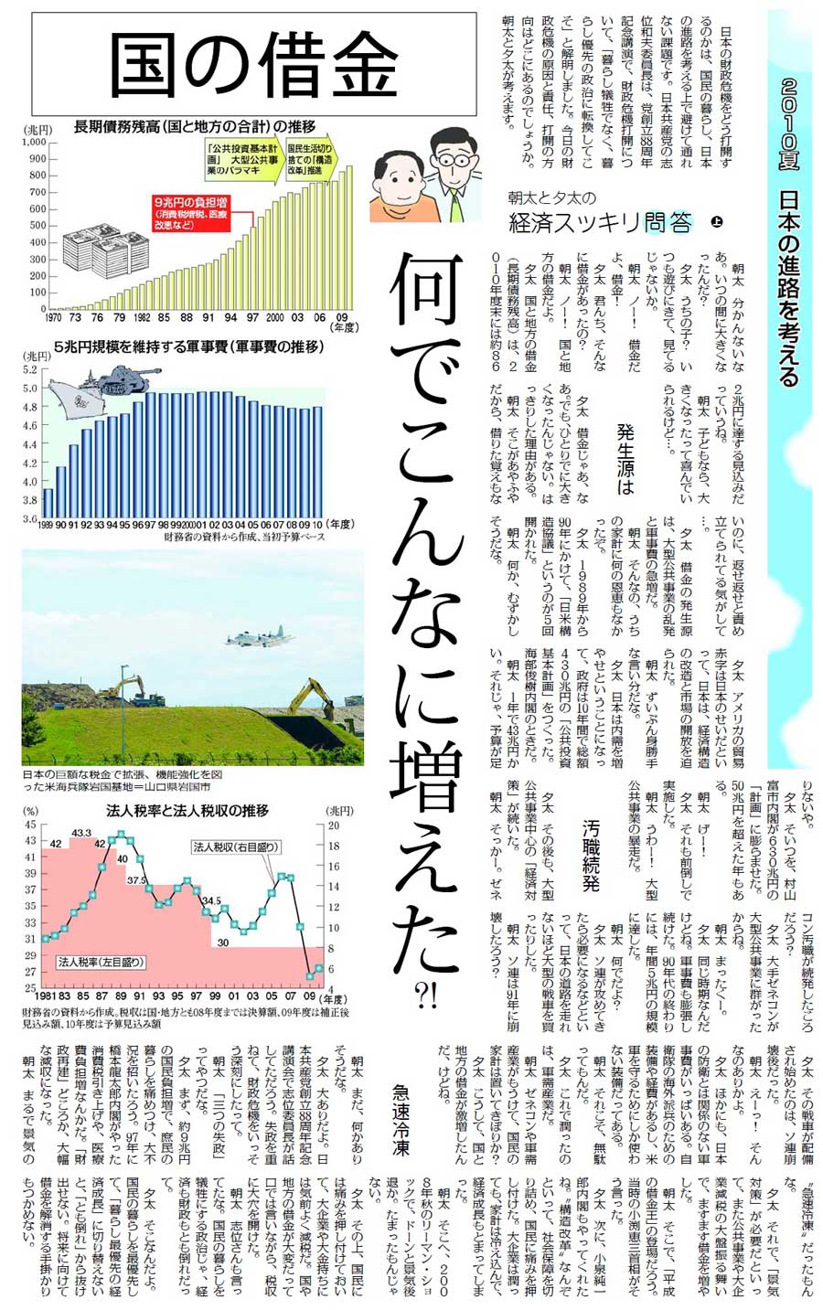 「2010夏 日本の進路を考える」シリーズは、これまで「軍事費」(12日付)、「国の借金」(18日付)、「経済改革」(19日付)、「社会保障」(24日付)を掲載。軍事費の企画「日本だけ聖域なぜ? 欧州は軍縮なのに」には、「たいへんわかりやすい好企画です(紙面1、紙面2)。軍事費の削減が(1)財政問題(2)東北アジアの平和、の二つの面から具体的な数字をあげて説得力のあるものになっています」(東京都中野区・男性)との感想が寄せられました。