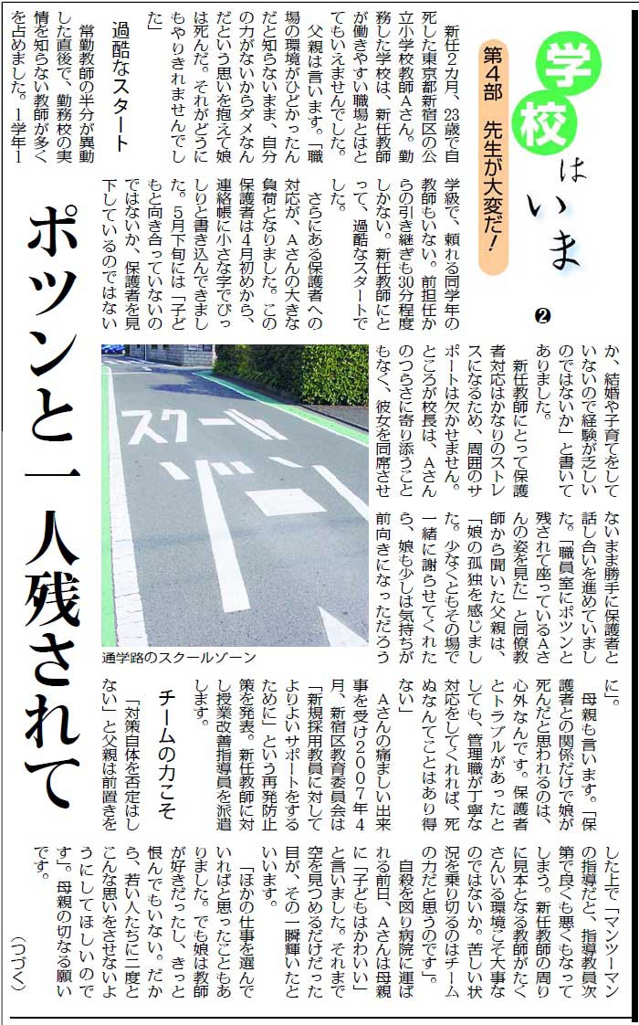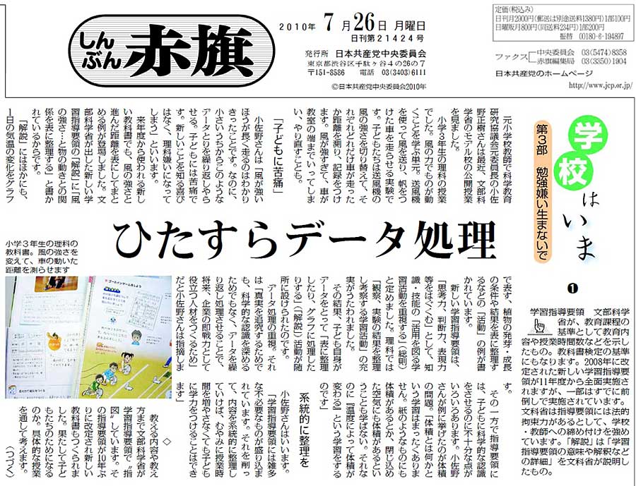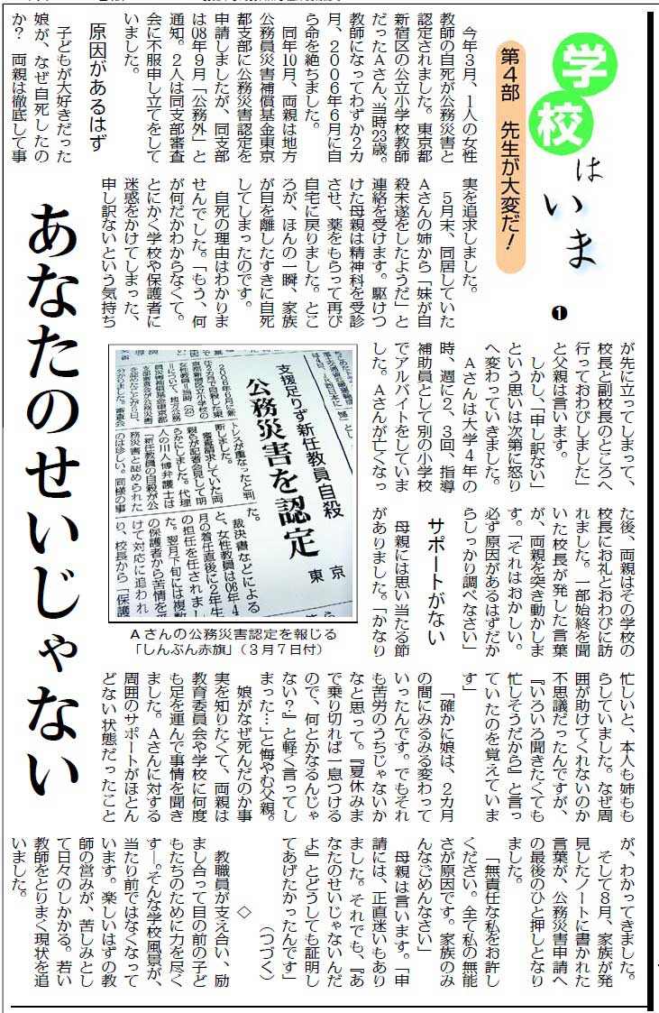 社会部・くらし家庭部の共同企画「学校はいま」は、参院選後に「第3部 勉強嫌い生まないで」(7月26日〜8月3日まで7回)(紙面1、紙面2)、「第4部 先生が大変だ!」(8月12日〜19日まで8回)(紙面1、紙面2)を掲載。「『学校はいま』の記事は、残念ですが、悲しい現実をリアルに映し出しています」「教師の自死をとりあげながら、学校の異常な状態、そのなかで苦しむ教師が描かれています」「静かな怒りと教師や子どもへのやさしい思いが込められていて、ほんとうに読み応えがありました」など多数の感想が寄せられています。