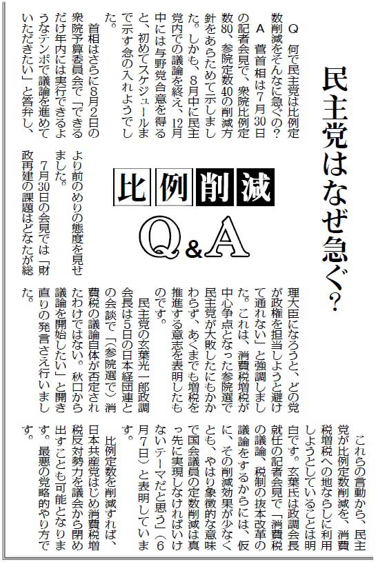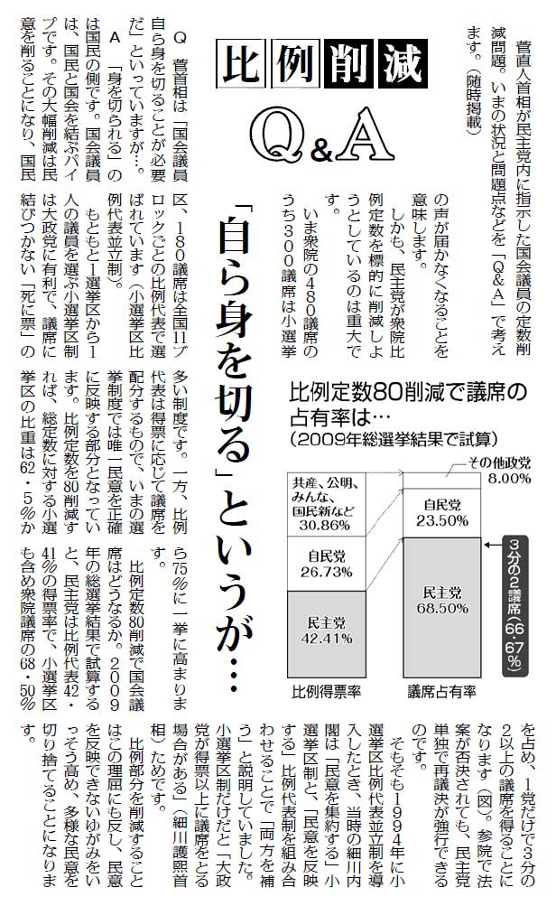 菅直人首相が衆院の比例定数80削減に意欲を示すなか、「しんぶん赤旗」は、議会制民主主義を守る立場から比例定数削減に反対するとともに、あるべき選挙制度を考えるキャンペーンを張っています。