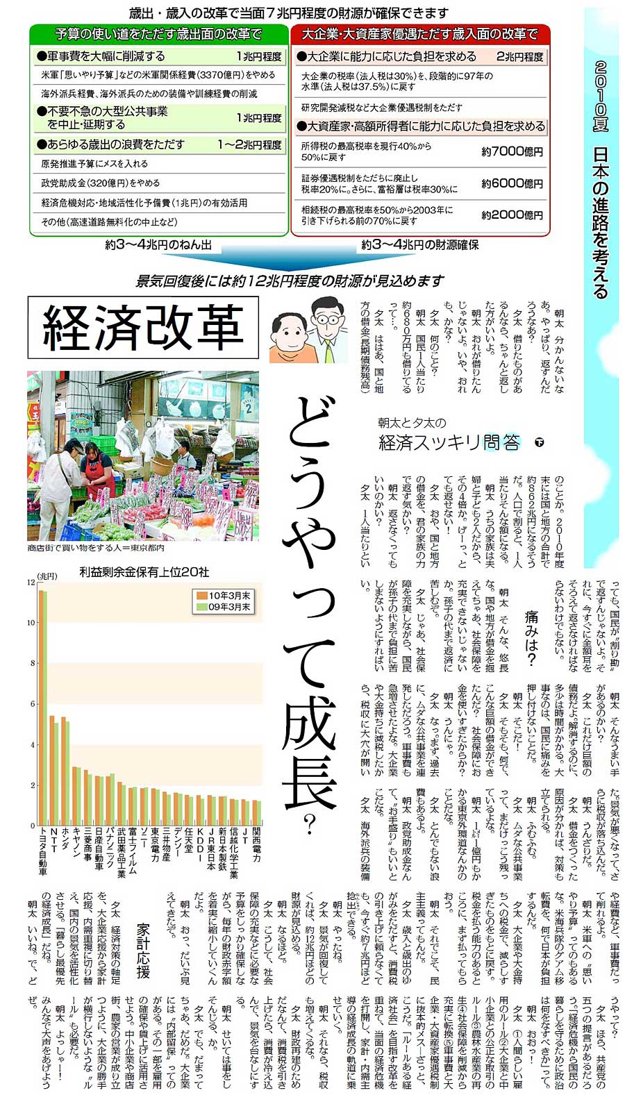 また、「国の借金」(紙面)や「経済改革」(紙面)は問答形式でわかりやすく、経済改革の展望を示しました。社会保障を扱った24日付の「『不安大国』なぜ 経済力はあるのに」(紙面1、紙面2)は、世界との比較もまじえながら、社会保障の現状と本来あるべき姿を浮き彫りにしました。