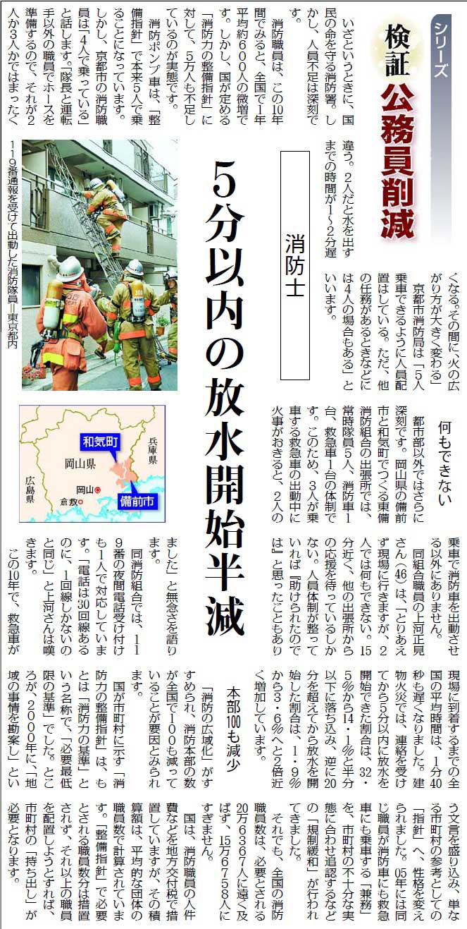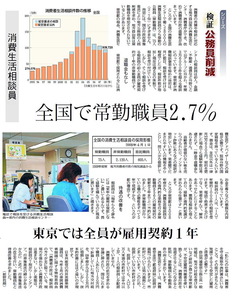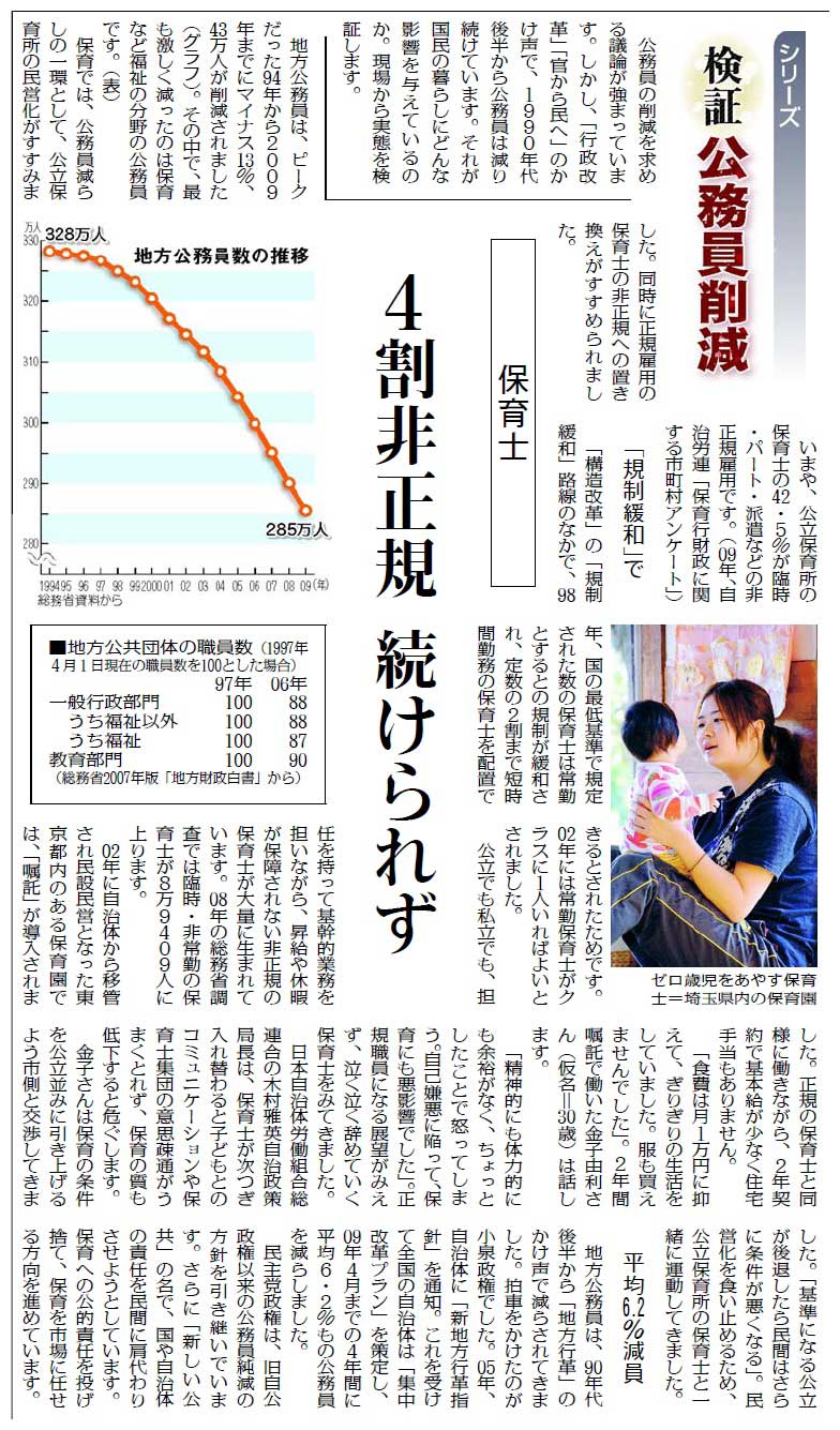 また、「シリーズ 検証・公務員削減」も、マスメディアや政界が公務員削減の大合唱をするなかで、現場のリアルな実態を示し、さまざまな問題点を指摘してきました。これまでとりあげたのは、保育士(7月15日、4割非正規続けられず=紙面)、消防士(7月16日、5分以内の放水開始半減=紙面)、児童福祉司(7月18日、相談増に対応できず)、消費生活相談員(7月30日、全国で常勤職員2・7%=紙面)、労基署・ハローワーク(8月17日、雇用の安心壊す人員不足)、小・中学校教員(8月18日、非正規教員が9人に1人)、学校給食職員(8月23日、行政が責任持てない状態に)。読者や関係する労働組合などから問い合わせが相次いでいます。