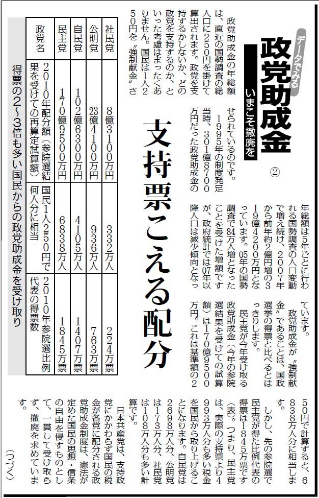 この間、1面で「世界一高い政党助成金」(紙面)を掲載したほか、「比例削減Q&A」(紙面1、紙面2)「データでみる政党助成金」(紙面1、紙面2)「インタビュー企画 比例定数削減・ここが問題」などの連載やシリーズを連打しています。読者からは「毎日興味深く読んでいます」「比例定数削減は必ず阻止しなければならない課題です」「工夫しているのがわかります。さらにもう一工夫を」などの声が寄せられています。また、一般紙からは広報部を通じて「資料がほしい」「試算のやり方を教えてほしい」などの問い合わせもくるなど、反響を広げています。