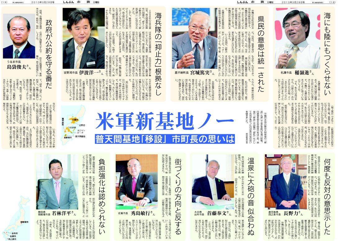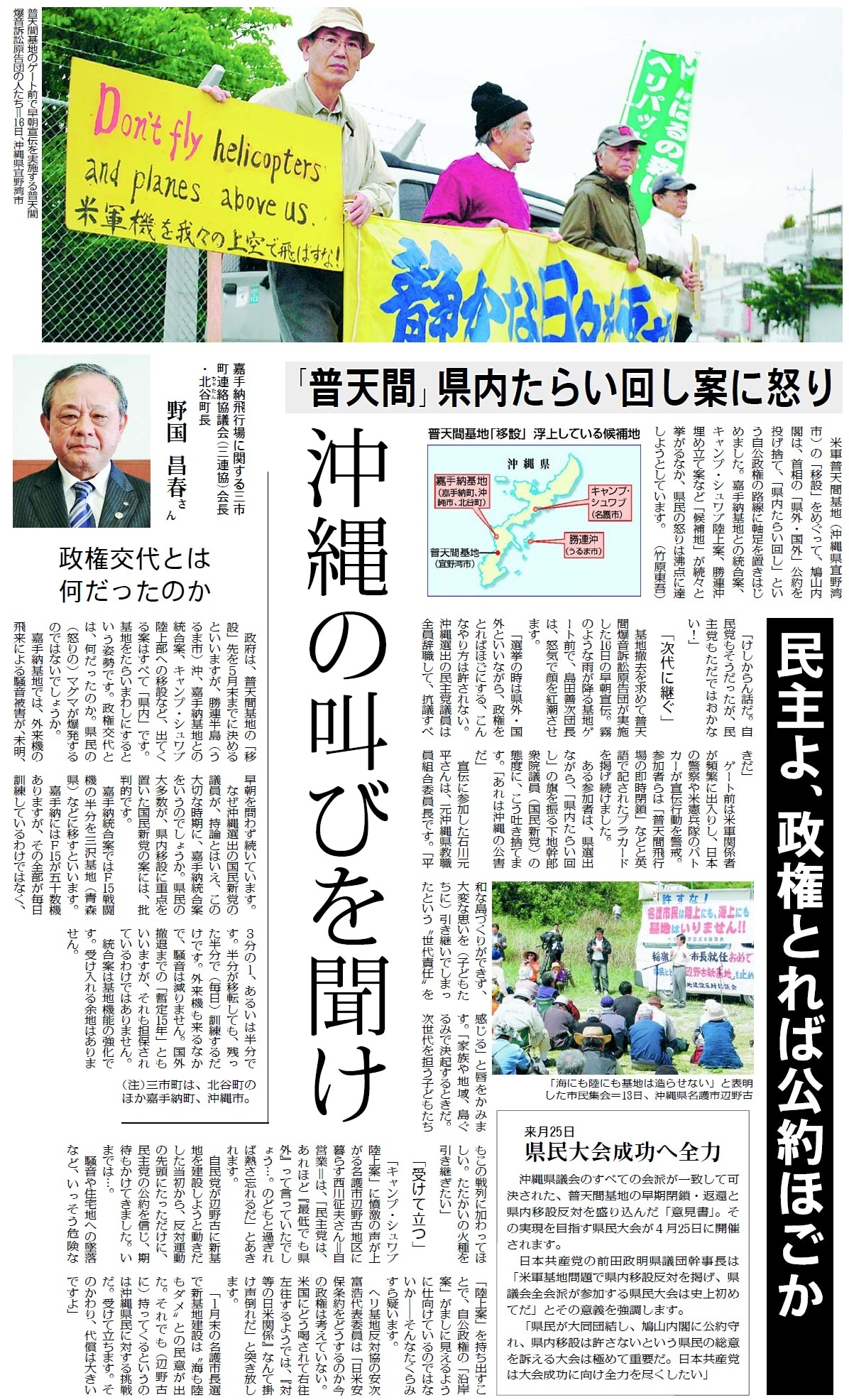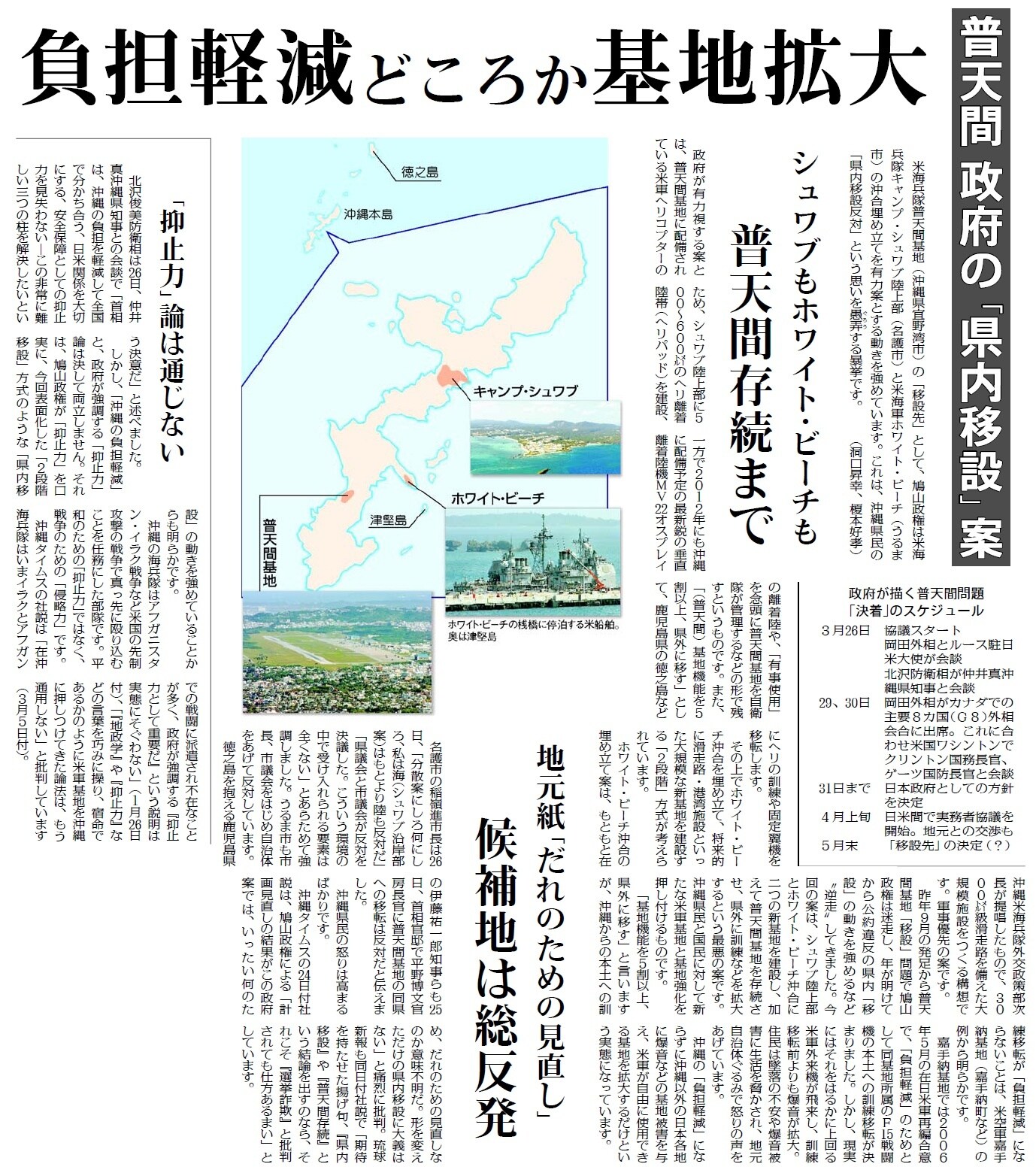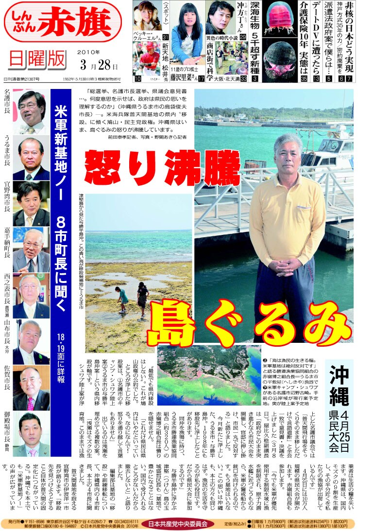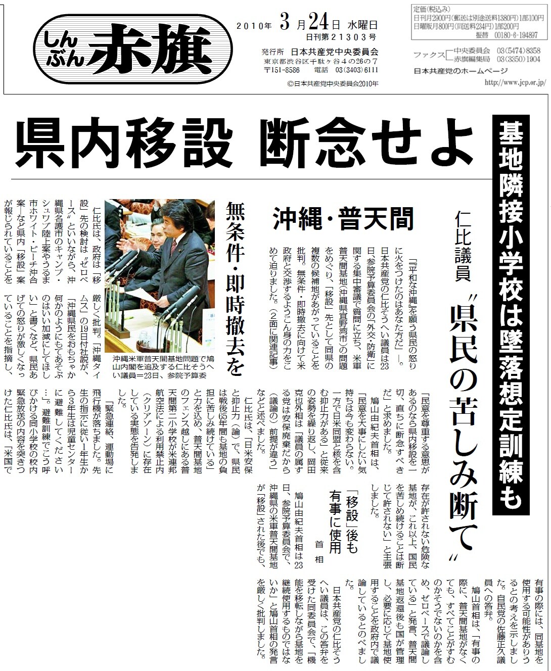 3月27日付では、政府がすすめようとする県内「移設」案は「負担軽減どころか基地拡大」とズバリと指摘。3月22日付は「沖縄の叫びを聞け 民主よ、政権取れば公約ほごか」と怒りを伝え、仁比そうへい参院議員が予算委員会で「県内移設を断念し、無条件・即時撤去にむけて米政府と交渉せよ」と鳩山首相に迫ったことを報じています(3月24日付)。