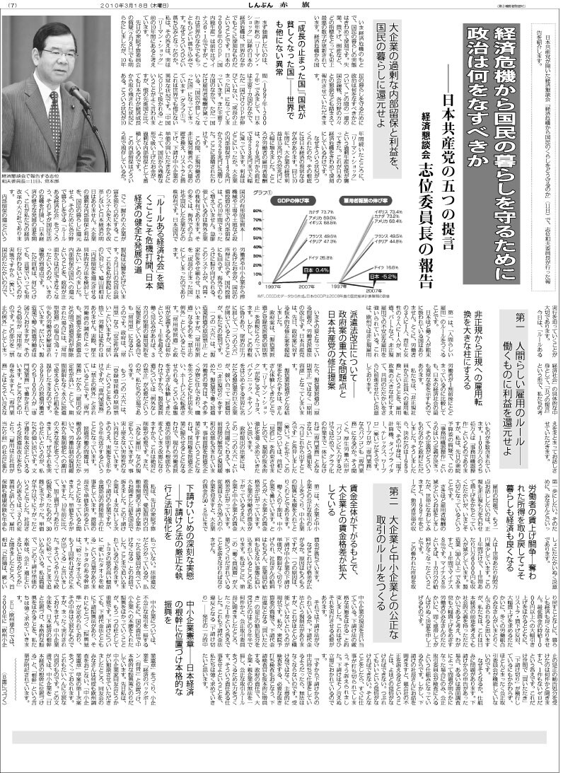 「赤旗」3月18日付は、党が開いた経済懇談会での「大企業と中小企業との公正な取引のルールをつくる」提言についての志位委員長の報告を掲載しています。