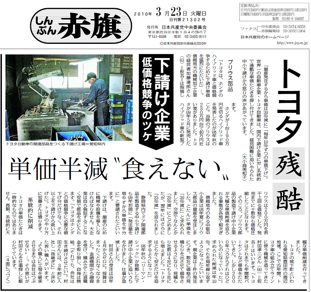 3月23日付では「トヨタ残酷」の見出しで、他社のハイブリッド車との「価格競争」を名目に単価を50%も減らされた下請け業者の声を紹介し、「乾いたタオルを絞ってももう何も出ない」と、生の声で告発しています。
