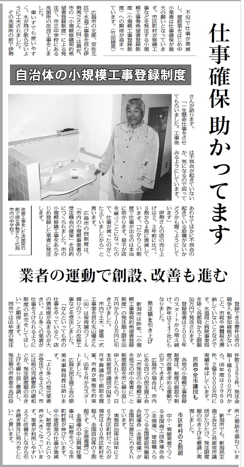 3月24日付の国民運動面では、自治体が修繕工事などを発注する「小規模工事登録制度」を取り上げ、不況下でも地元中小業者が確実に仕事が確保できる施策を紹介しています。