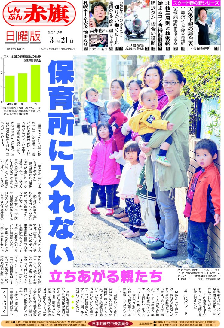 日曜版3月21日号は、「安心して預けられる保育園を増やして」と広がっている親や保育士たちの運動を特集。待機児童解消と保育所増設を求め、立ち上がっている姿を伝えています。