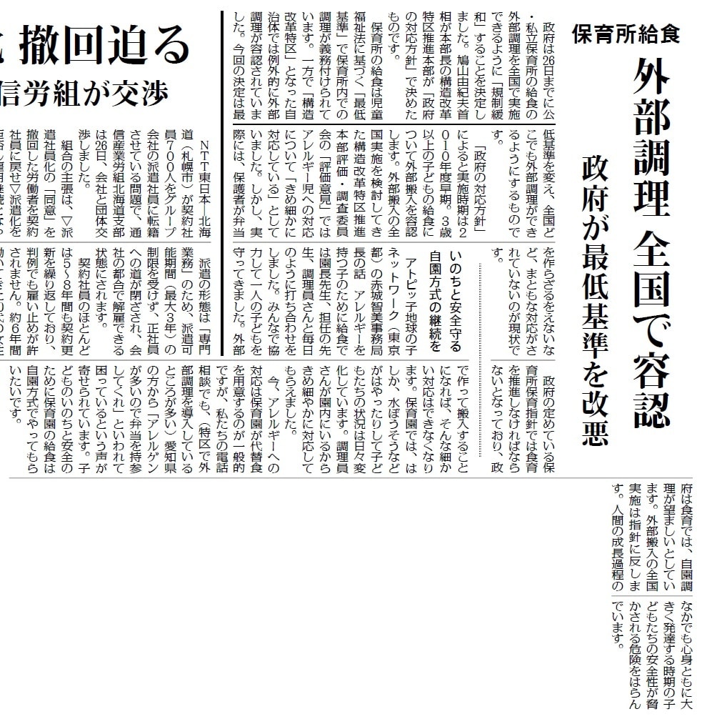 日刊紙3月27日付は、政府が保育所給食の外部調理化を全国実施すると決定したことに、「政府が最低基準を改悪」と報道し、子どもの発達より「規制緩和」を上におく政府の姿勢を批判しています。
