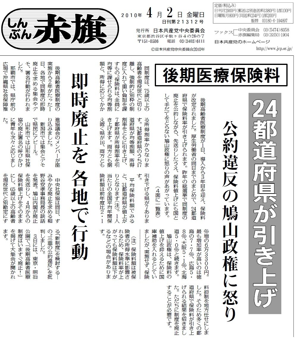 制度廃止を1日延ばすごとに広がる重い負担―。日刊紙の4月2日付で、今月から、後期医療保険の平均保険料額が31都道府県で値上がりになると報道。鳩山内閣が国庫補助を増やさなかったため「多くの都道府県で保険料が引き上げられる結果を招いた」と指摘しています。