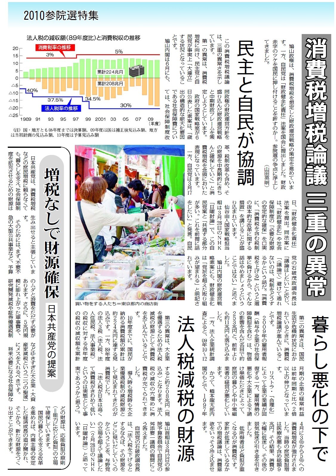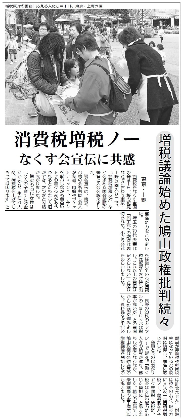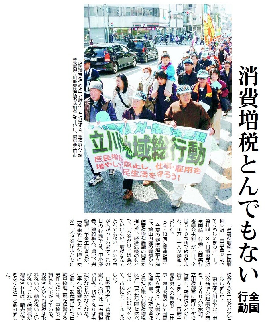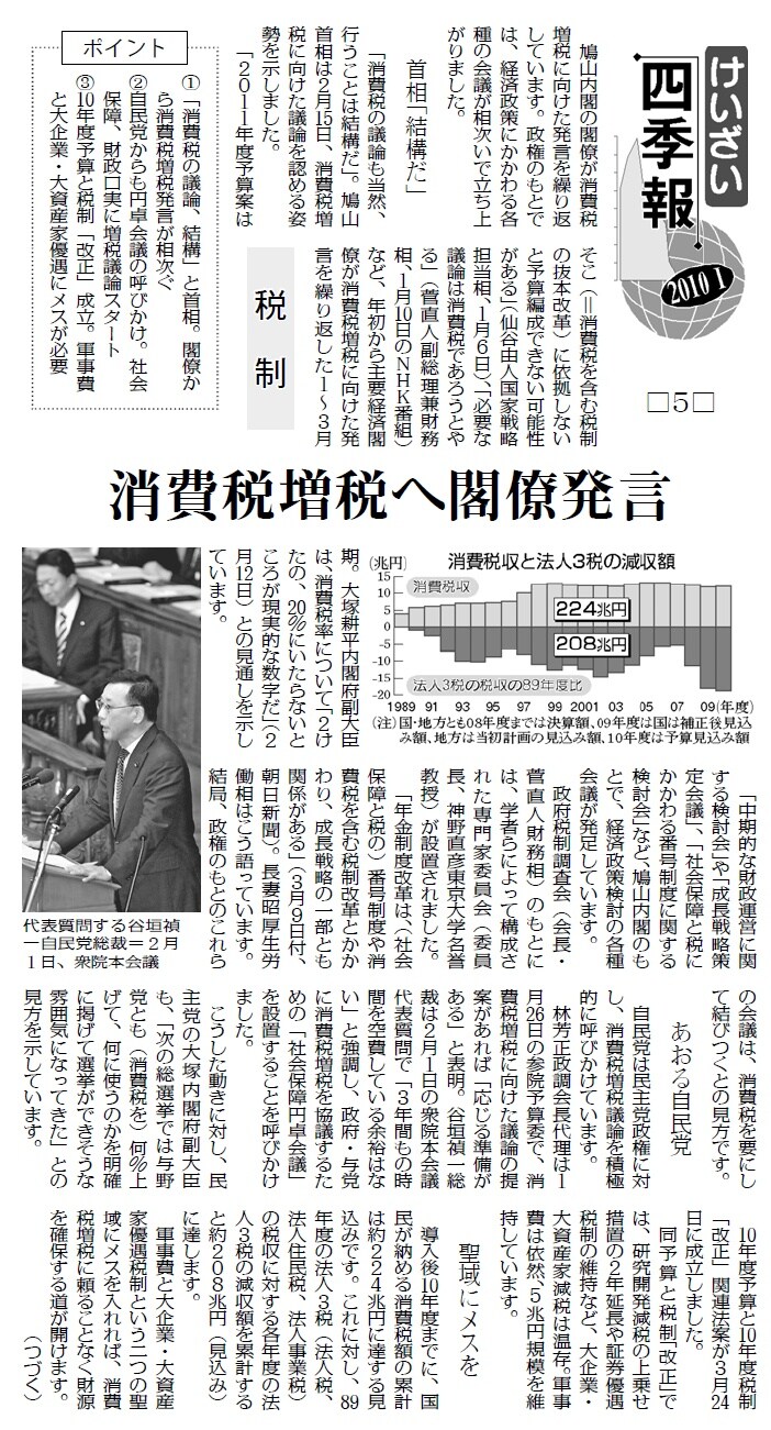 4月3日付「けいざい四季報」では鳩山内閣の閣僚が消費税増税にむけた発言を繰り返し、自民党がこれをあおっていることを解説。4月2日付「消費税増税ノー なくす会宣伝に共感」、3月13日付「消費税増税とんでもない 全国行動」をはじめ、国民の増税反対の運動を連日のように報じています。
