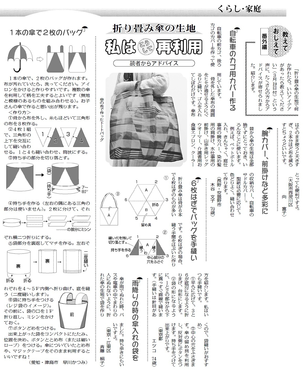 読者の声や知恵を大切にしたのが、「教えておしえて」。読者同士の交流欄です。最近では、使われなくなった折りたたみ傘の生地の再利用について「教えて」との投書を紹介しました。これをきっかけに、再利用法の投稿が相次ぎ、6日付は一気に読者からの再利用法を特集しました。