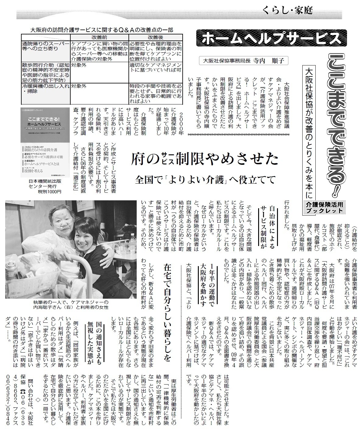 15日付の「ホームヘルプサービスここまでできる!」では、大阪社会保障推進協議会の介護保険制度改善のとりくみを紹介しました。掲載当日と翌日だけで、社保協に90件以上の問い合わせがあったといいます。