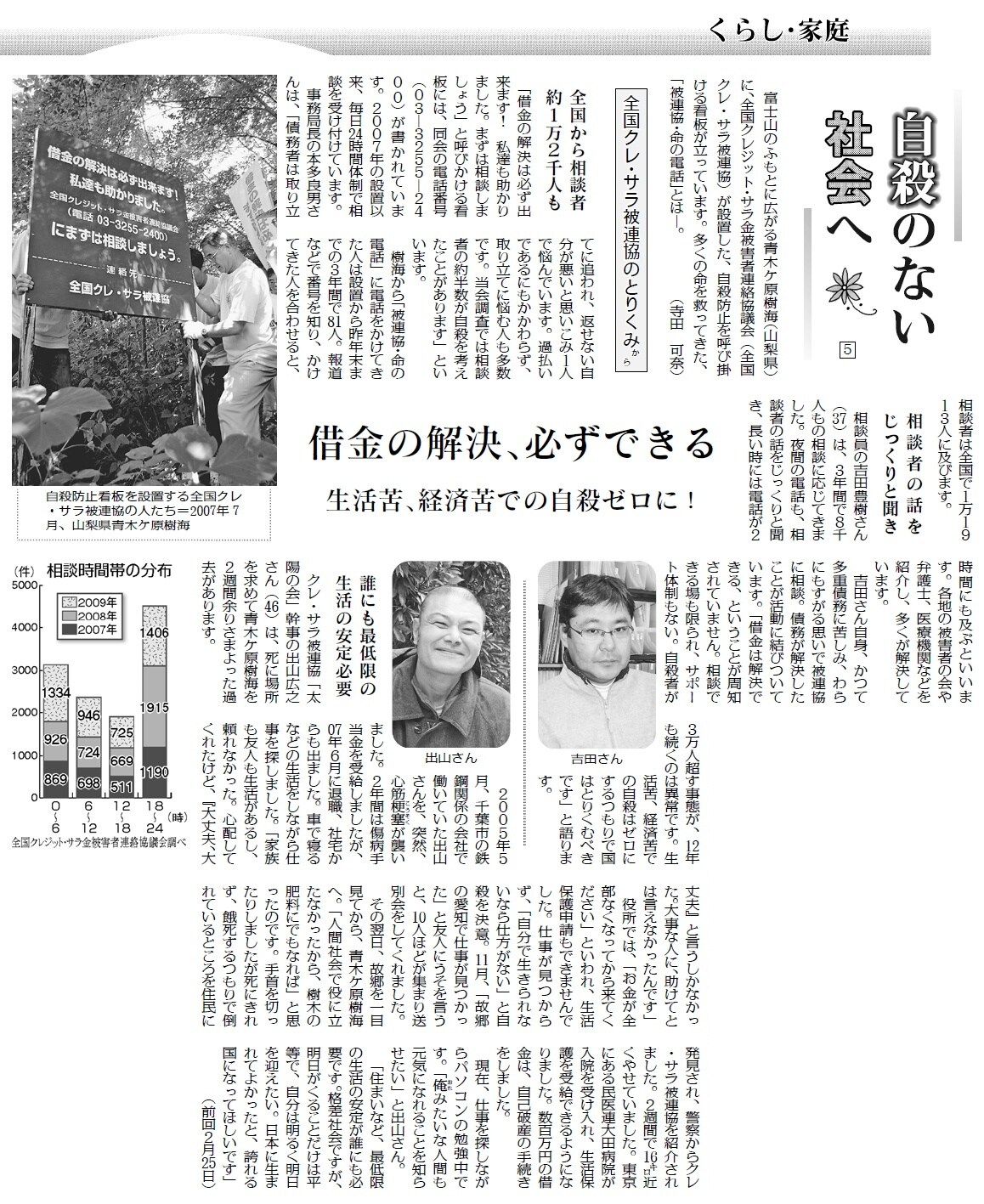 シリーズで掲載しているのが「働き方とうつ」や「自殺のない社会へ」です。自殺、うつというと、自己責任に原因を求めがち。しかし、シリーズでは「働き方」や社会の病理に目を向けています。長時間・使い捨て労働、能力主義の押し付け、多重債務、失業―。これらがなにをもたらすか、背景と原因に迫っています。「うつ病」と診断された53歳の小学校教師の「『働き方とうつ』に注目している」など多くの感想・相談が寄せられています。